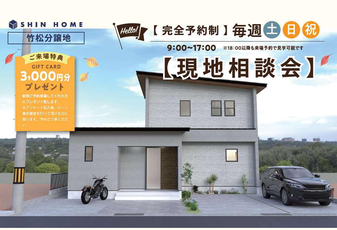 3分譲地合同 現地相談会 開催中 開催日 2025/10/18(土)~2025/11/03(月) 時間 9:00~17:00 18:00以降も予約にて可能 場所 大村市宮小路三丁目1404-3 他 こんにちは! 大村の分譲地にて現地相談会を開催いたします。 ・竹松分譲地(3区画) ・宮小路分譲地(24区画) ・黒丸分譲地(10区画) 宮小路では建築中の建売物件2棟もありますので、お時間がありましたら、ご見学も可能です。 皆さまの理想の暮らしをイメージしてみてください(^O^)/ ご来場特典としてギフトカード3,000円分のプレゼントを行っています。